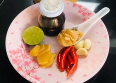 เต้าเจี้ยว , น้ำตาลปี๊บ , น้ำตาลทราย , ขิ งแก่ , กระเทียม , พริกขิ้ห นู , มะนาว , น้ำกระเทียม ด อ ง