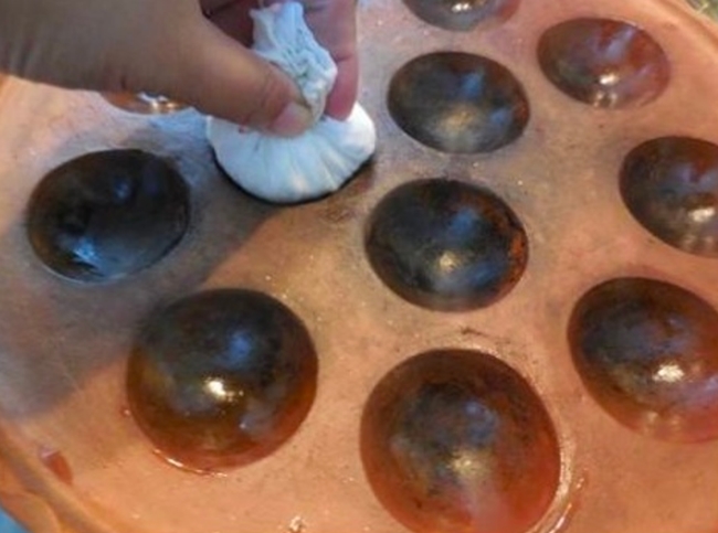 3. ตั้งถาดขนมครกบนเ ต า ใช้ผ้าทำเป็นลูกกลมๆ เหมือนลูกประค บ ชุ บน้ำมันเช็ดให้ทั่วถาด