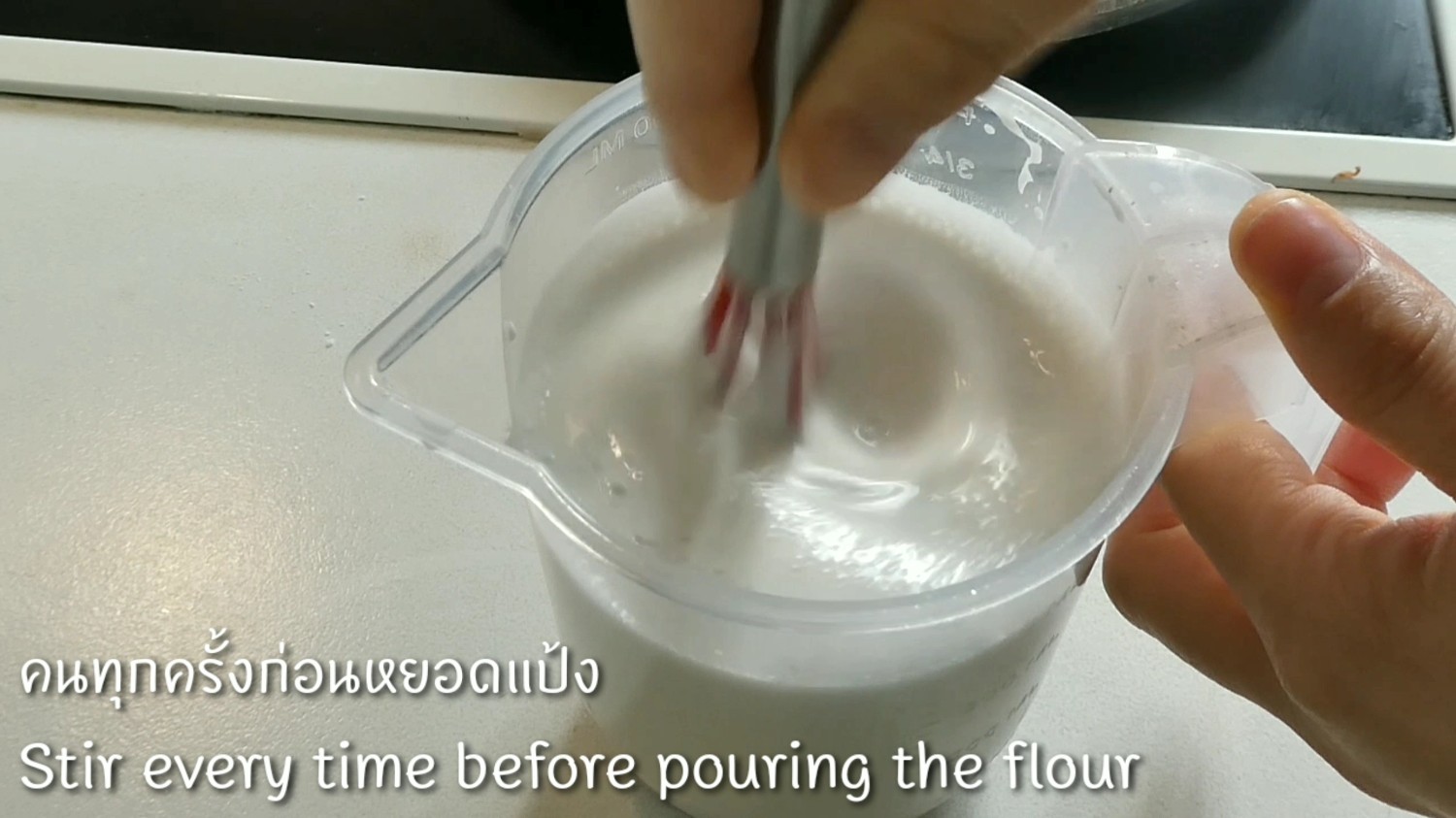 ใส่แป้งข้าวเจ้าตามลงไป คนให้ละลายเข้ากันแล้วพักไว้