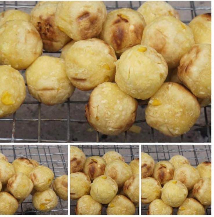 5. นำส่วนผสมมันมาปั้นเป็นก้อนกลม ๆ ขนาดพอประมาณ จากนั้นนำมาปิ้ ง บนเตาจนสุ ก หรือเปลี่ยนเป็นสีเหลืองอ่อน ๆ