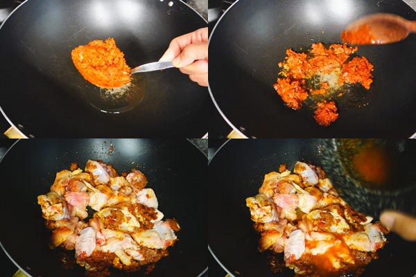 3.ตั้งกะทะใช้ไ ฟกลางค่อนอ่อนใส่นำ้มันลงเล็กน้อยนำพริกแกงลงผัดจนหอม>ตามด้วยไก่ที่รวนไว้>
