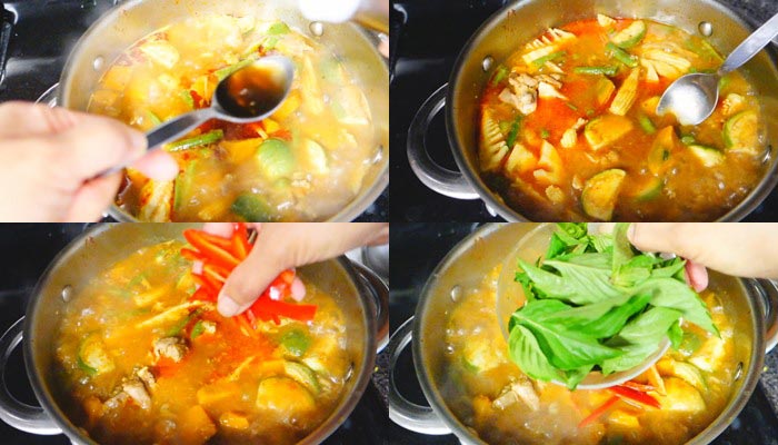 4.ใส่ผักที่สุ กย ากลงก่อน>ใบมะกรูดพริกสดกระชายซอยพริกไทยสดสักพักใส่ใบกะเพราลงปิดเตาพร้อมเสริฟแล้วค่ะ