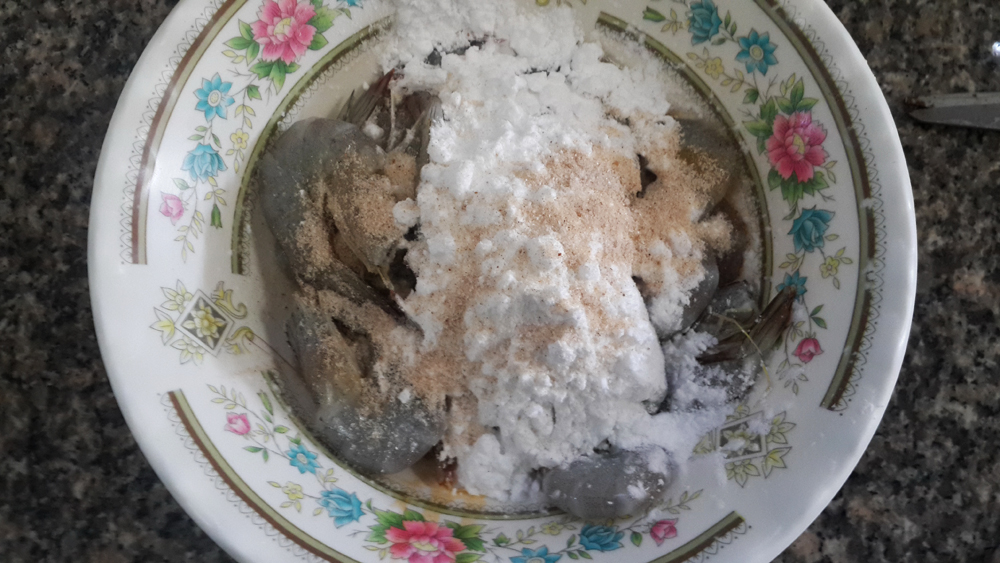 4…นำกุ้งที่หมักไว้ ลงไปชุปแป้งที่ผสมไว้