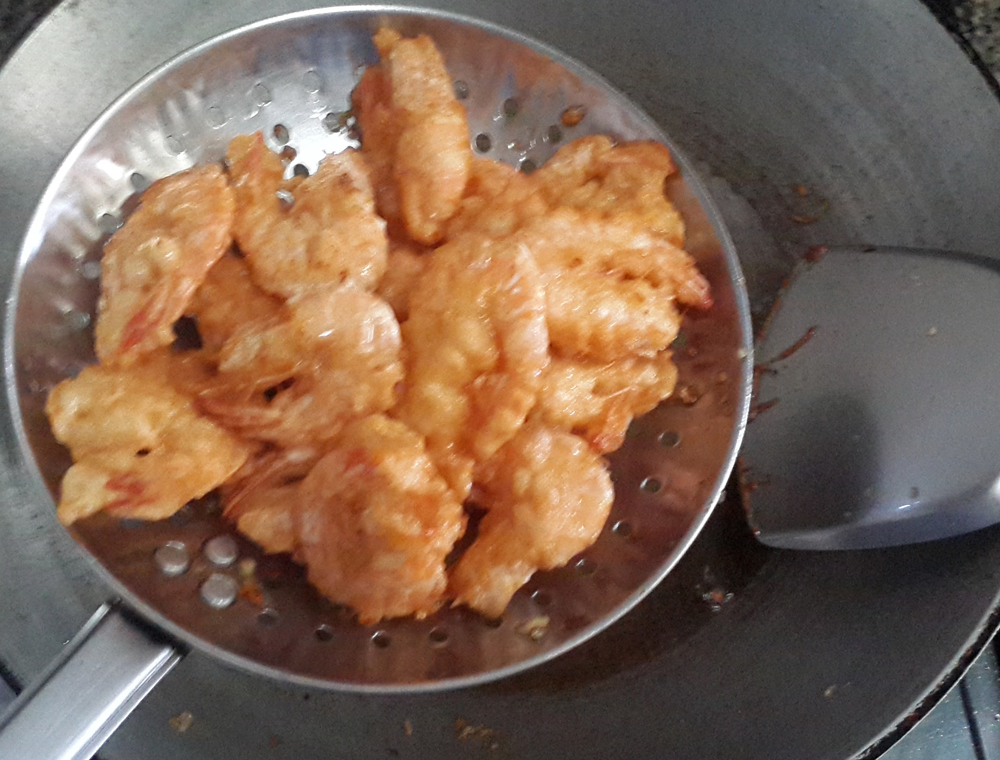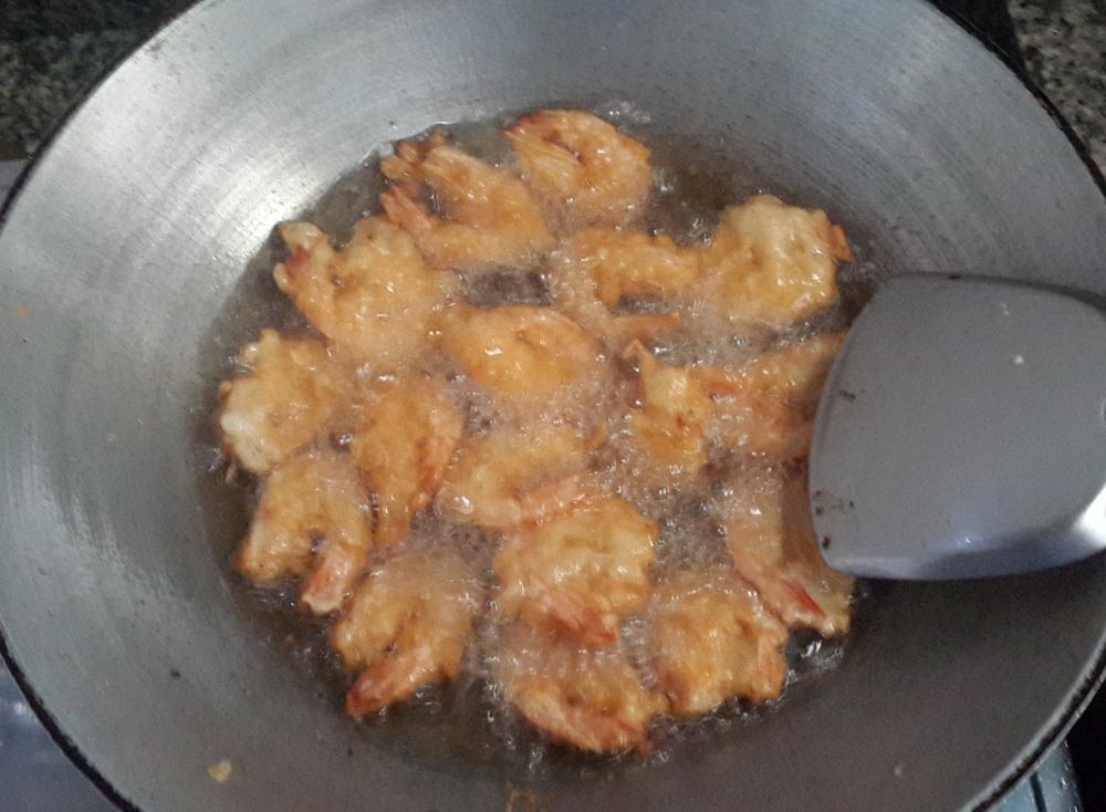 5…ตั้งกระทะใส่น้ำมันลงไป พอน้ำมันเริ่มร้ อ น ก็นำกุ้ง ลงไปทอดได้เลยค่ะ ทอดจนสุ กเหลืองกรอบ