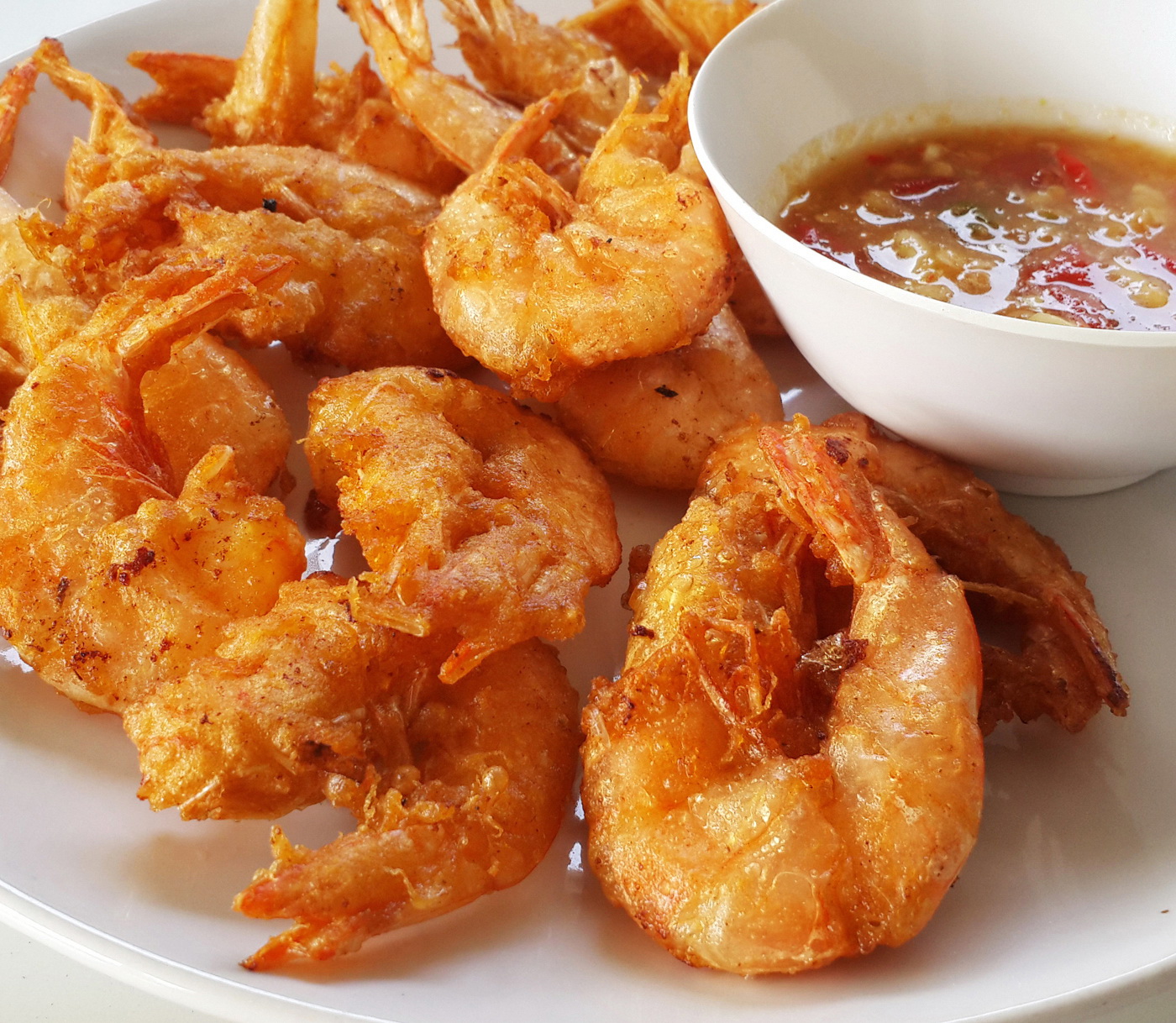 ตักขึ้นสะเด็ดน้ำมัน จัดกุ้งทอดใส่จาน เสิร์ฟคู่กับ น้ำจิ้ม แซ่บๆ