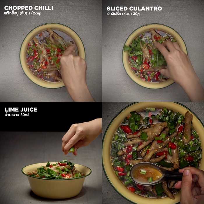 บี บมะนาวลงในถ้วย ตามด้วยพริกขี้หนูสวนบุ บ ผักชีฝรั่งซอยและต้นหอมซอย