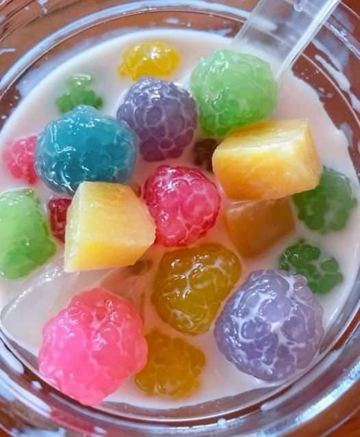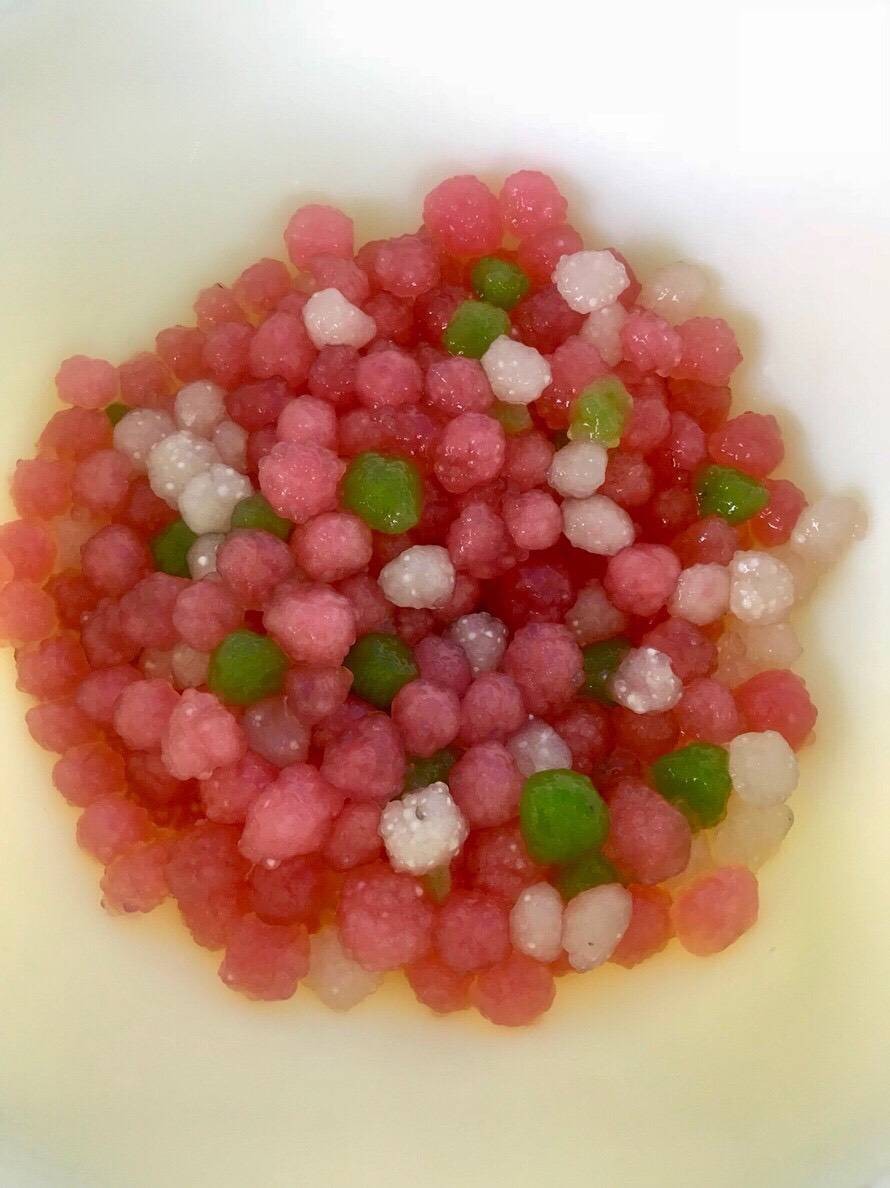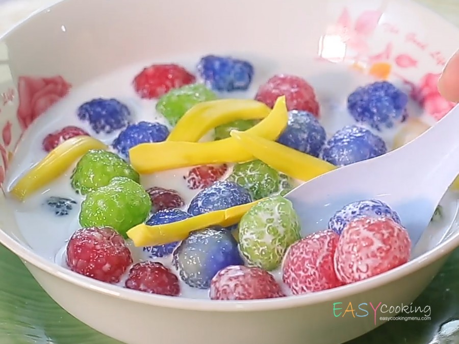 1.นำน้ำมาผสมสีแล้วนำสาคูมาผสมกับน้ำ แล้วปั้นเป็นก้อนตามที่ต้องการ