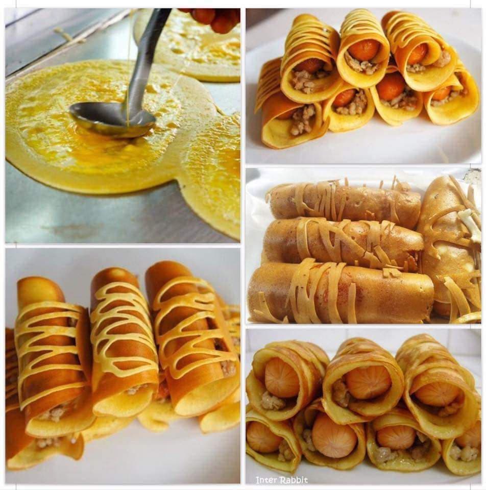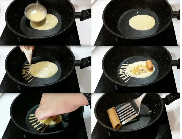 5. ใส่หมูสั บ และฮอทด็อกที่เตรียมไว้ลงไป จากนั้นม้วนจากฮอทด็อกขึ้นไปหาหมูสั บ