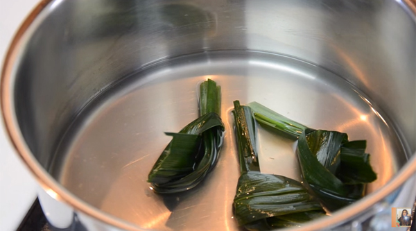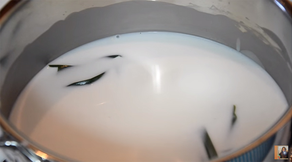 ► เทน้ำมะพร้าวลงไปในหม้อ นำขึ้นตั้งไ ฟกลางอ่อน ตามด้วยใบเตย