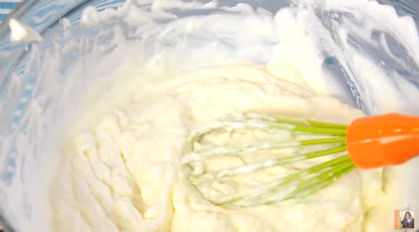► ผสมน้ำตาลทรายที่เหลือกับไข่ขาว ตีให้เข้ากันจนตั้งยอดอ่อน
