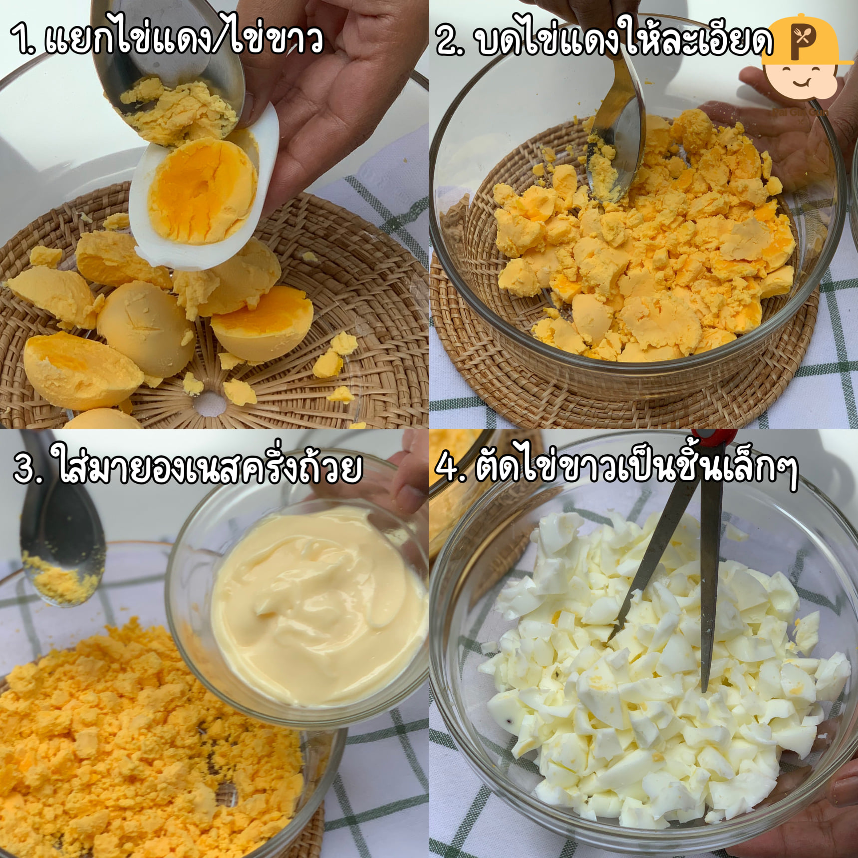 2. เอาแต่ไข่แดงมาบ ด ใครขอบเนียนก็คนบ ดมากหน่อย ใส่นม มายองเนสญี่ปุ่น มากน้อยแล้วแต่ชอบ เกลือ น้ำตาลหยิบปลายนิ้ว