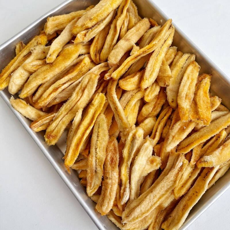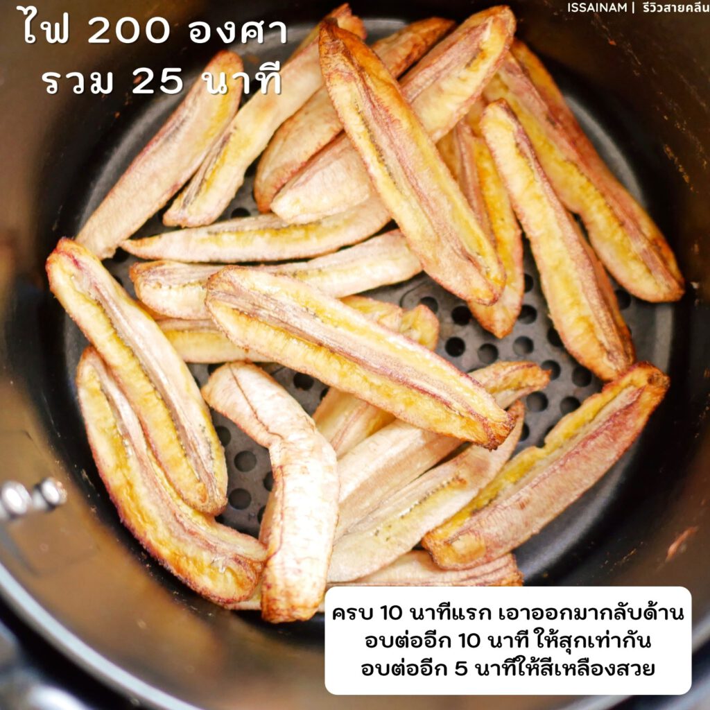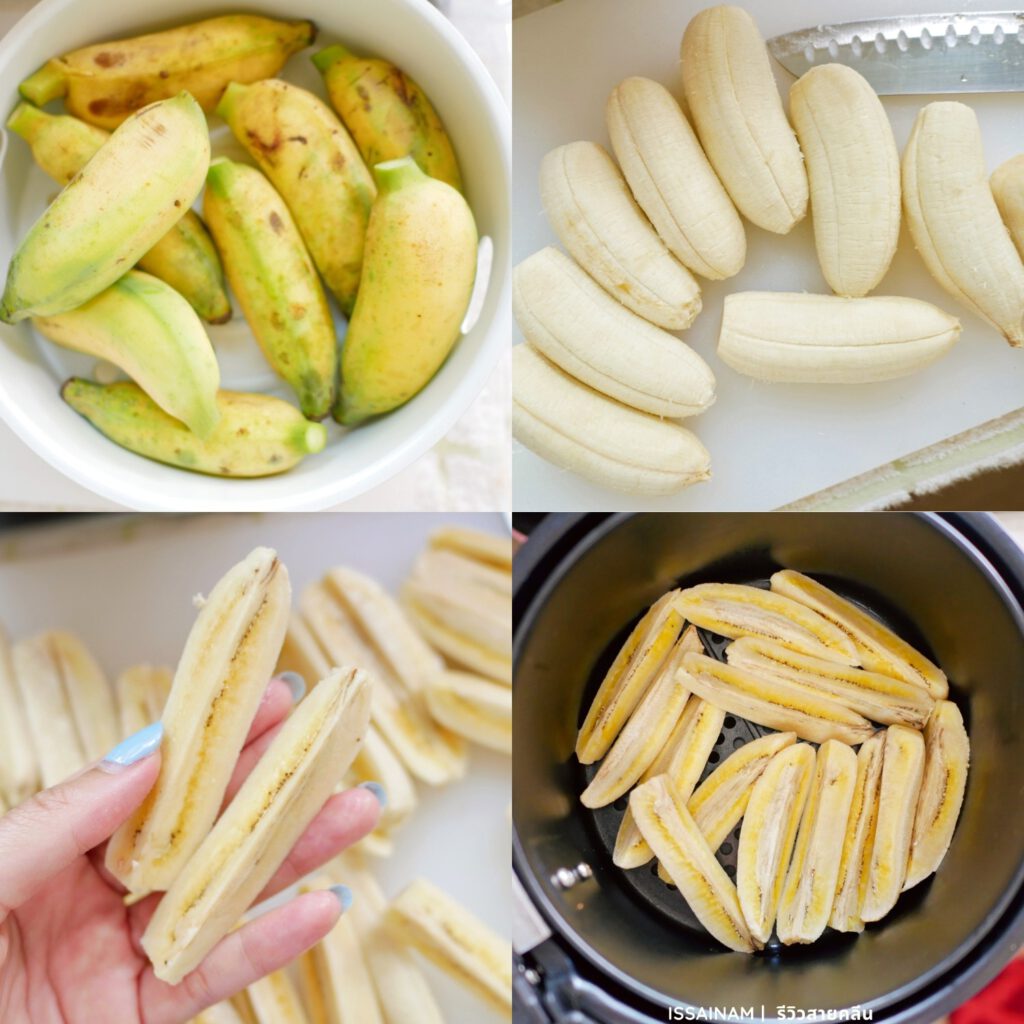 เอากล้วยน้ำว้ามาหั่ นยาวแบ่ง 4 เป็นแท่งๆแบบเฟรนซ์ฟรายเลย ใช้หม้อทอดไร้น้ำมัน ปรับไ ฟ 200 องศา