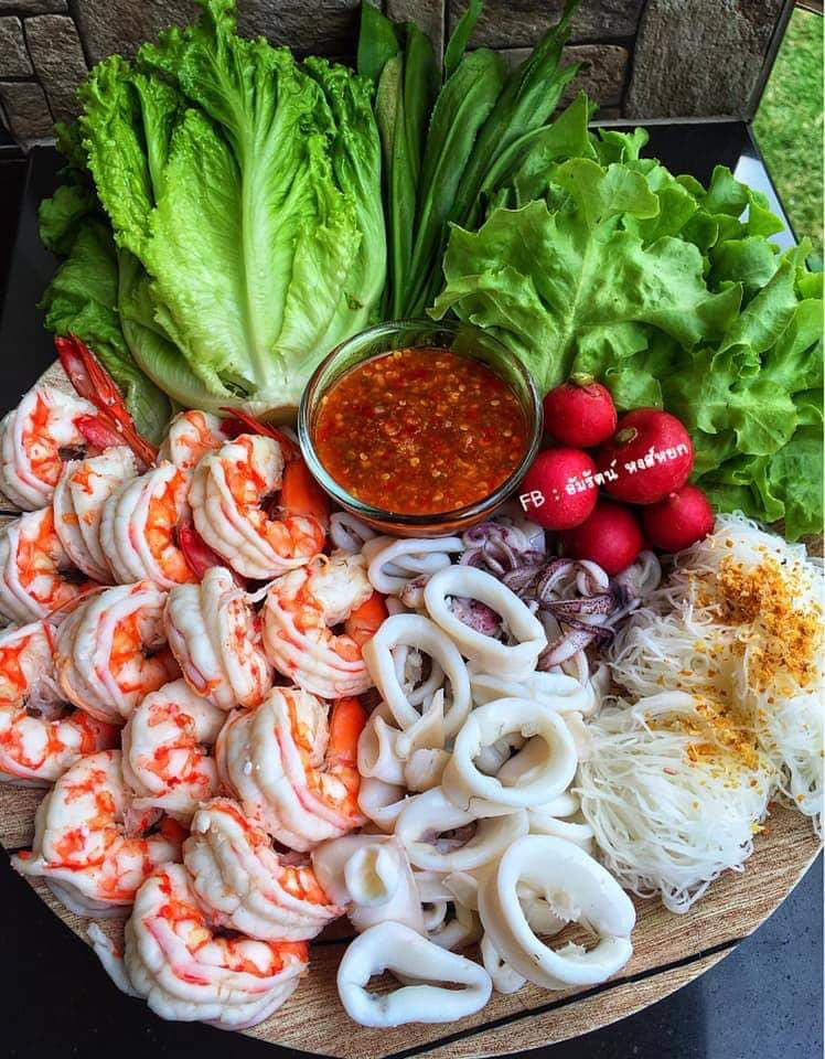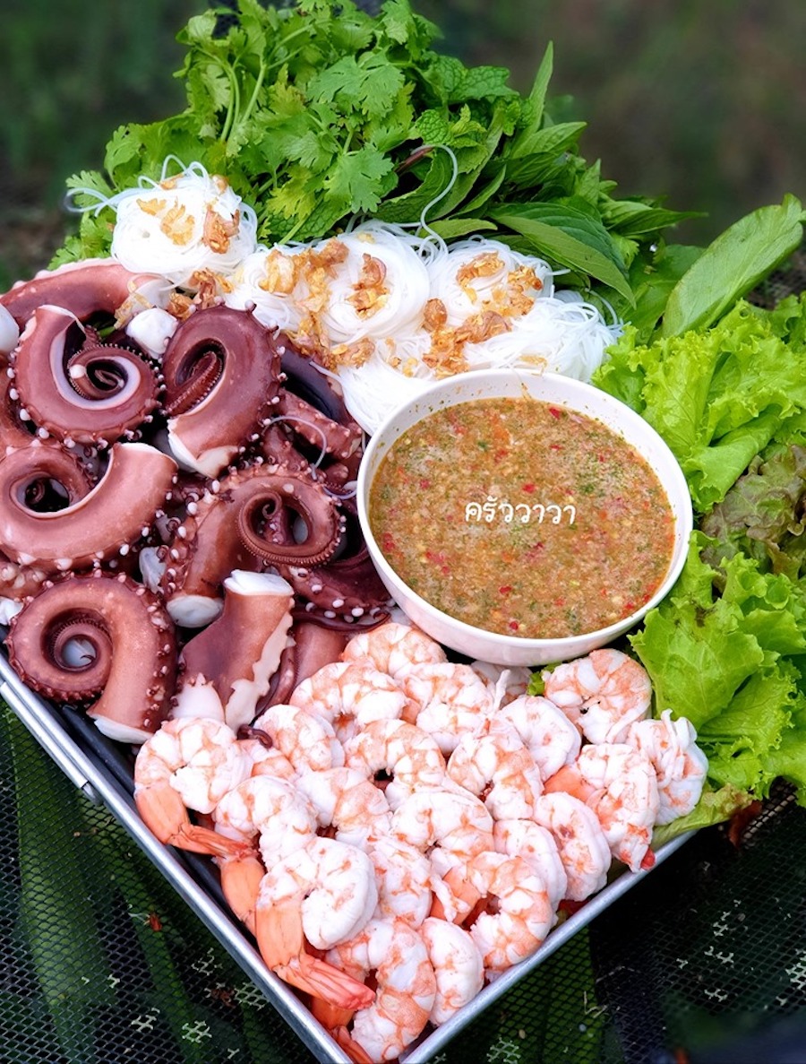 4…จัดกุ้ง ป ล าหมึก เส้นหมี่ และผักเครื่องเคียง จัดใส่ถาดที่เตรียมไว้ เสิร์ฟคู่กับน้ำจิ้มแซ่บๆ