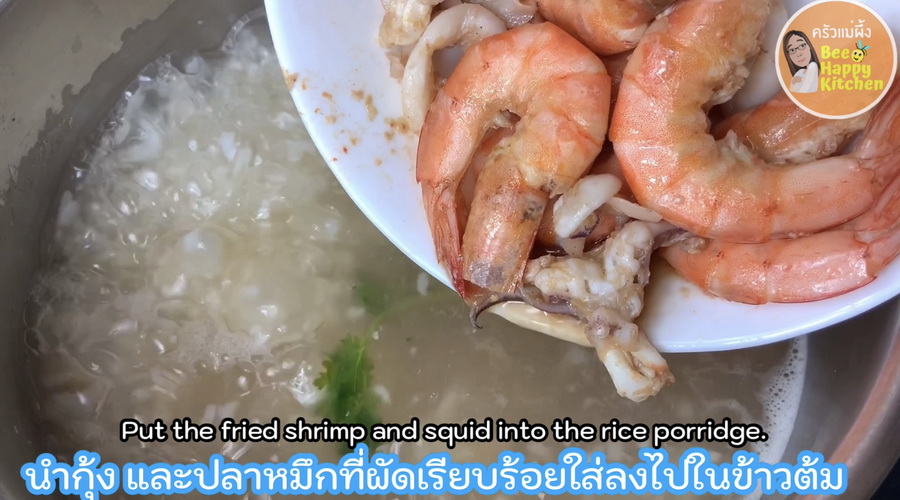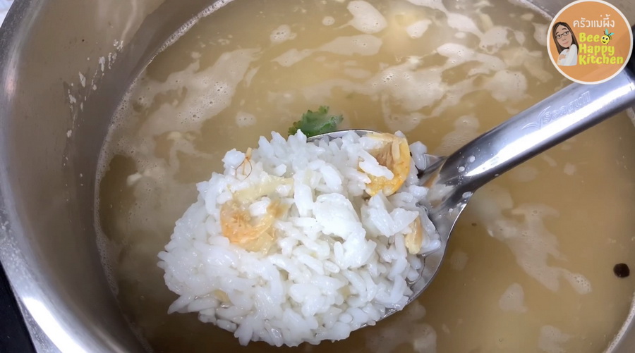 ล้างสะอาด หม้อใส่น้ำตั้งไ ฟ ใส่ตั้งฉ่ าย เกลือหยิบมือ. ใส่น้ำป ล า ต้มน้ำเ ดื อดสักพัก ปั้นหมูใส่. หมูสุ ก ยีข้าวใส่ ตามด้วย ใส่กุ้งสด