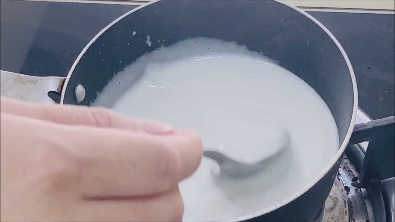 1.ใส่กะทิ และแป้งข้าวเจ้า คนให้เข้ากัน