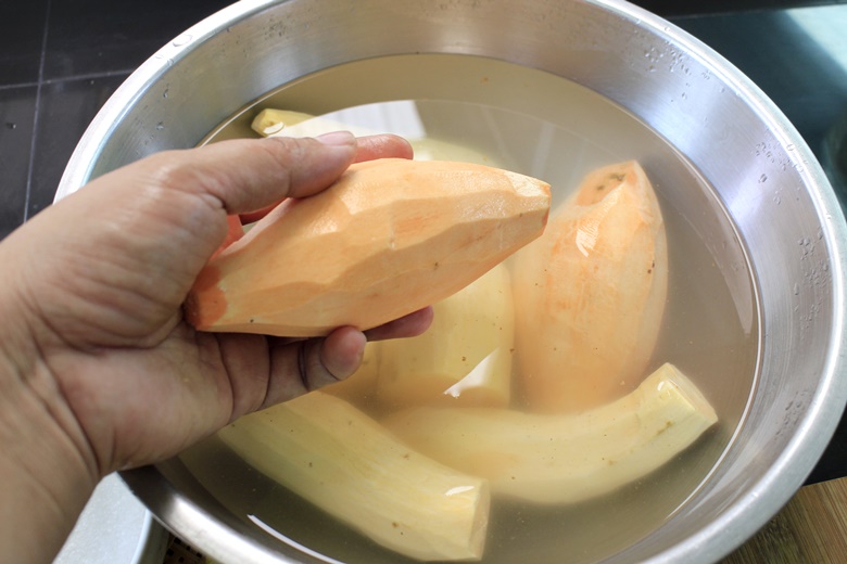 1.ปอกเปลือกมันเทศ หั่ นชิ้ นตามชอบ