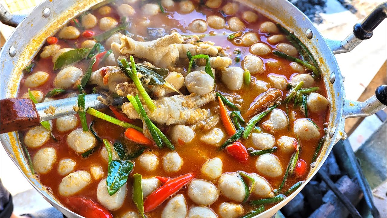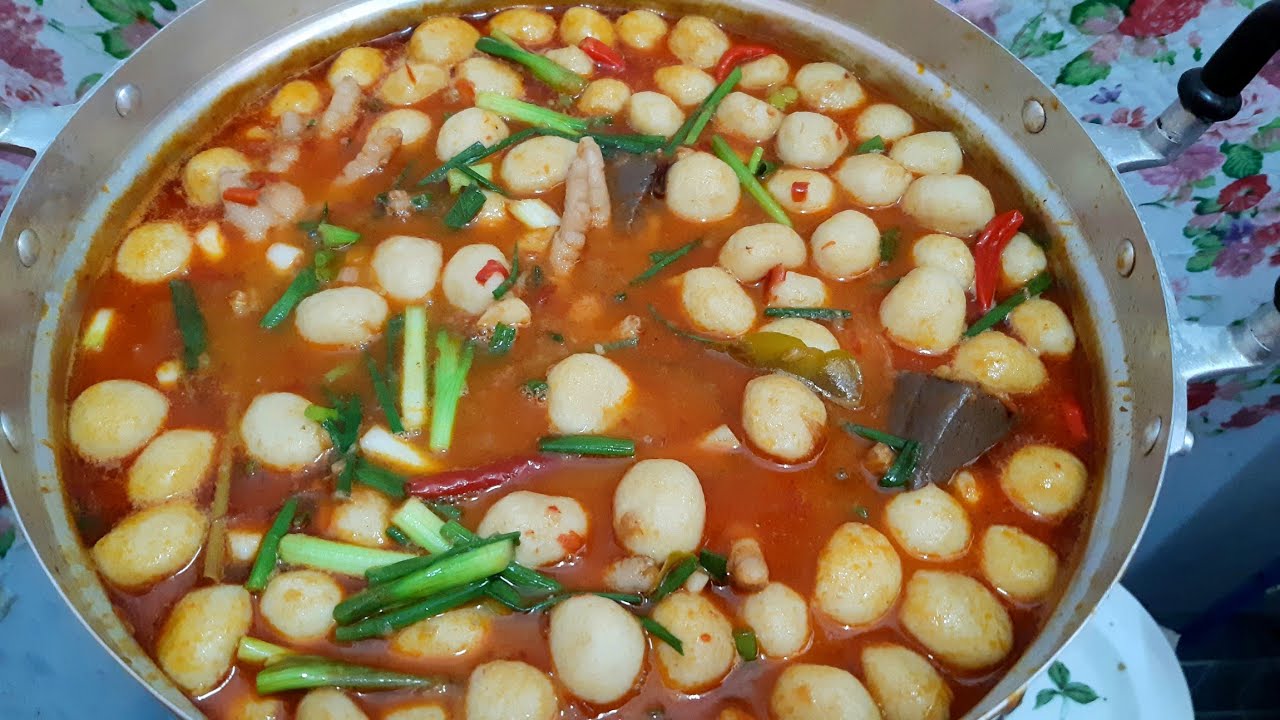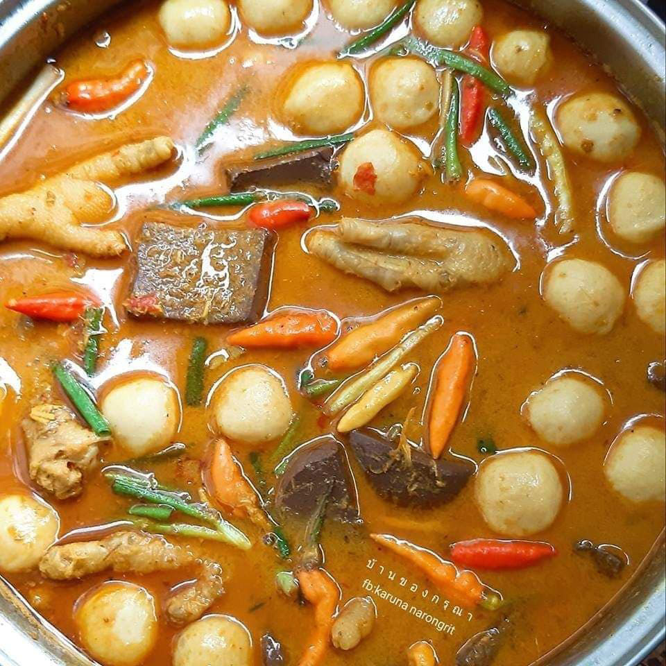 ปรุงรสด้วยเกลือและน้ำตาลปี๊ป ใส่ลูกชิ้นปล า ,เ ลื อ ดไก่ และ ข าไก่ที่ต้มจนเ ปื่ อ ย