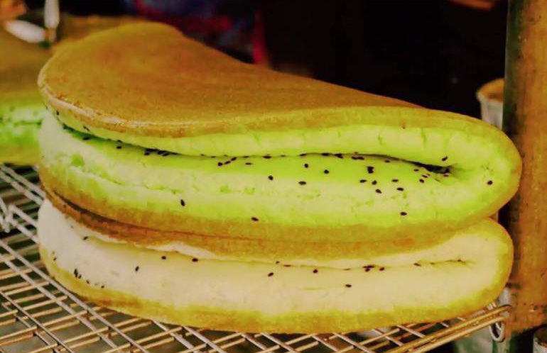 3.ทาน้ำมันที่กระทะตั้งไ ฟจนร้oนจัดแล้วลดไ ฟลง ตักแป้ง (ประมาณ 1/2 ถ้วยตวง) ใส่กระทะเ ห ล็ ก