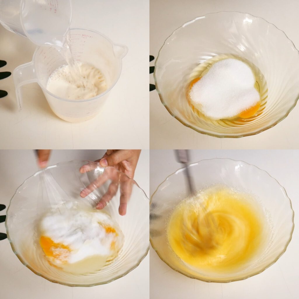 2. นำไข่และน้ำตาลทราย ใส่ลงชามผสม ตีให้เข้ากัน