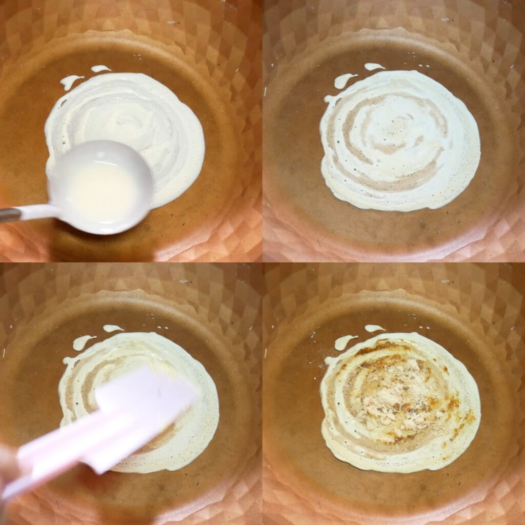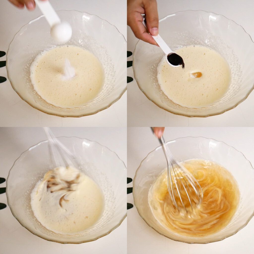 3. ใส่น้ำตาลทราย กลิ่นวนิลาแล้วคนให้เข้ากัน