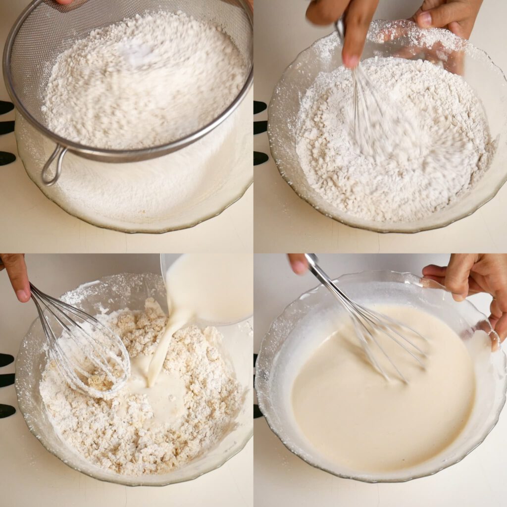 4. ร่อนแป้งข้าวเจ้า แป้งสาลีอเนกประสงค์ และเบกกิ้งโซดา ร่อนรวมกันใส่ลงช ามผสม แล้วตะล่อมให้เข้ากัน