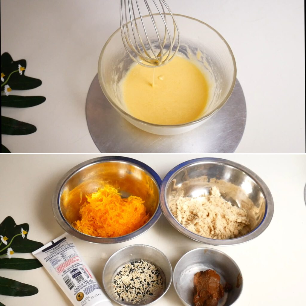 8. ระหว่างรอแป้ง ให้ทำน้ำเชื่อมทาเครป สำหรับใช้กับไ ส้ฝอยทอง โดยนำไข่แดง และน้ำตาลทราย