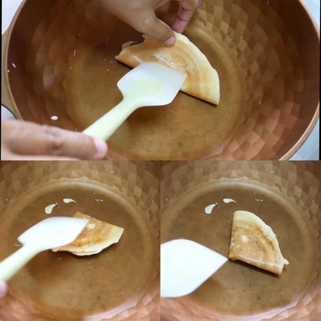 11. เมื่อแป้งพักครบเวลาแล้ว ให้นำกระทะตั้งไ ฟอ่อน แล้วหยอดแป้งลงกระทะเกลี่ยให้เป็นแผ่นกลมบางๆ ยิ่งบางแป้งจะยิ่งกรอบ