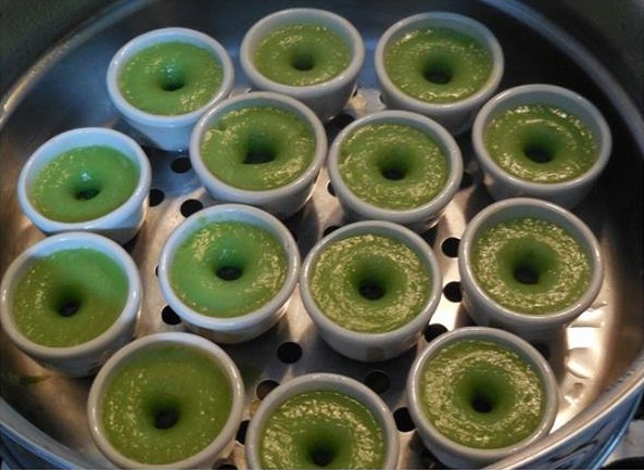 – นำถ้วยตะไลใส่ซึ้งนึ่งให้ถ้วยร้ อ น ประมาณ 5 นาที หยอดแป้งลงไป จนเกือบเต็มถ้วย นึ่งจนแป้งสุ ก (ใช้เวลาประมาณ 12 นาที)