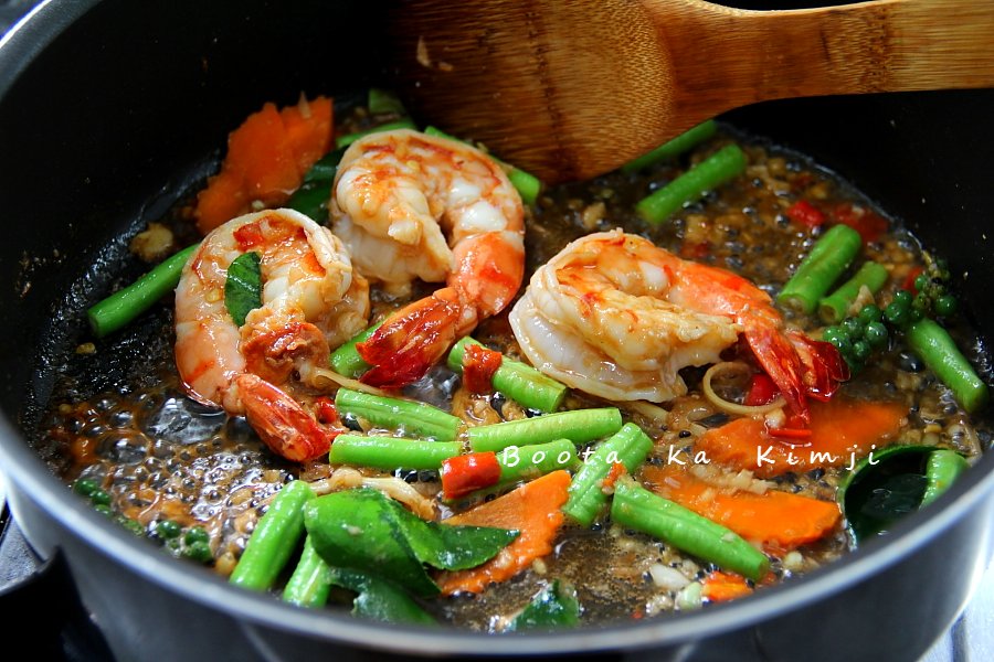 2 ใส่กุ้ง ปลาหมึก และหอยเชลล์ลงไปผัดพอสุ ก แล้วเติมน้ำผัดให้เข้ากัน