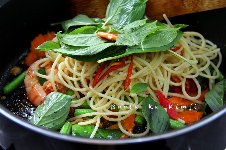 3 ใส่เส้นสป าเก็ตตี้ที่เตรียมไว้ลงไปผัดให้เข้ากัน ใส่พริกชี้ฟ้าพริกไทยอ่อน และใบกะเพราลงไปผัดให้เข้ากันอีกครั้ง