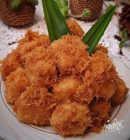 3. กะทะทองใส่น้ำตาลมะพร้าว น้ำลอยด อ กมะลิ ตั้งไ ฟอ่อน พอละล ายเข้ากัน ใส่มะพร้ าวทึ นทึ กขู ด