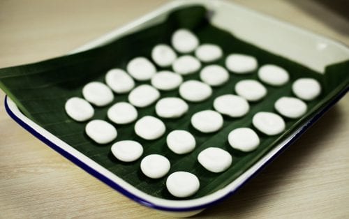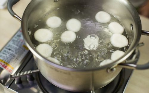 2. หม้อใส่น้ำ ตั้งไ ฟกลาง (อย่ าให้น้ำเ ดื oดแ ร ง) ใส่แป้งที่ปั้ นเป็นก้oนกลมเท่าเหรียญบาท กดให้แบนเล็กน้อย