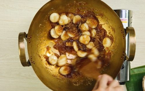 กวนจนพอให้มีน้ำหล่อเหนียวเล็กน้อย ตักออก 1/2ส่วนเก็บไว้ราดหน้า นำแป้งที่ต้ มสุ กแล้วใส่ค ลุ กในกะทะกับไ ส้ (ห น้ ากระฉี ก)