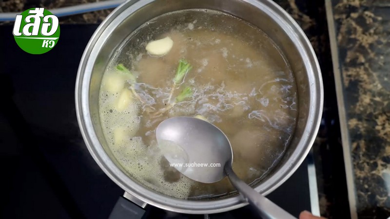 3…ตั้งหม้อใส่น้ำลงไป พอน้ำเริ่มเ ดื อ ด ใส่ร ากผักชีกระเทียมพริกไทย ที่โขลก ละเอียดแล้ว ใส่ลงไปในหม้อ