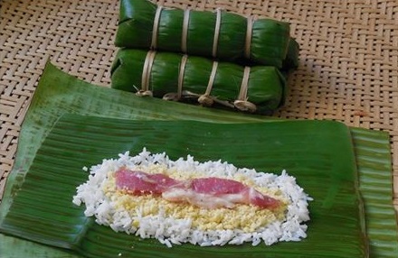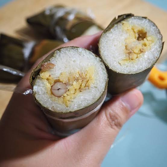 – ตักข้าวใส่ใบตอง ตามด้วยไส้ถั่ว และหมู ห่อให้เป็นกลีบยาว ใช้ต อ กมัดให้แน่น แล้วนำไปต้มในน้ำเ ดื อ ด 1 ชม.