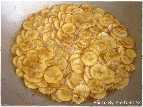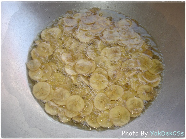 6.จากนั้นตามด้วยกล้วยที่เตรียมไว้ นำลงไปทอดในน้ำมัน
