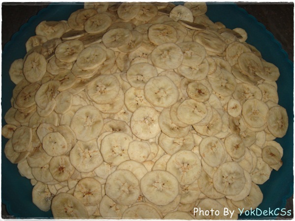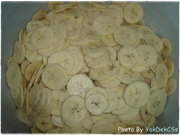 นำกล้วยมาหั่ นเป็นวงกลม ๆ ไม่ต้องหนามาก