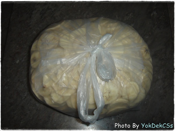 3.นำกล้วยที่หั่ นแล้วใส่ถุงพลาสติก มั ดป ากถุงให้แน่น อบมันไว้ 1 คืน