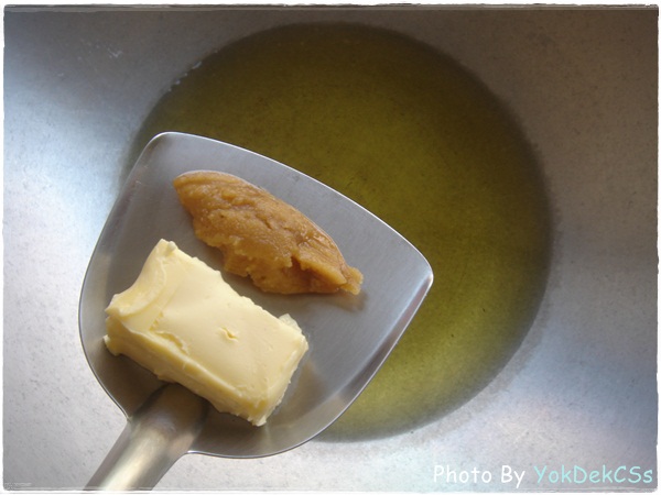 5.ตั้งกระทะใส่น้ำมันพืช พอน้ำมันร้ อ นก็ใส่เนยและน้ำตาลมะพร้าวลงไปคนให้ละลาย
