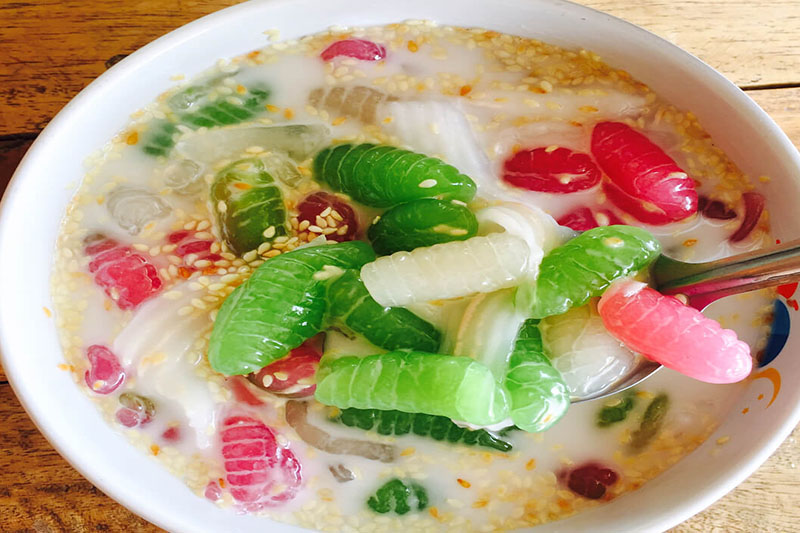 11. เสร็จแล้วก็เอาทั้งหมดมารวมกัน ใส่น้ำกะทิ ใส่น้ำเชื่อม ใส่ขนุนหั่ นเต๋า นิดหน่อย ใส่วุ้นมะพร้าว