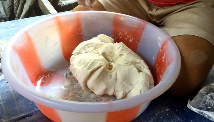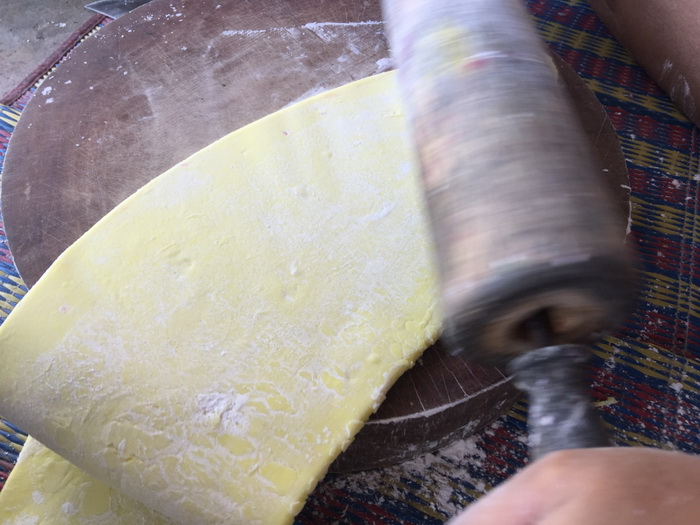 4. จากนั้นก็เอาไม้นวดแป้งนวดให้แบน เพื่อที่จะได้ตัดออกมาเป็นเส้นได้ง่ายๆ
