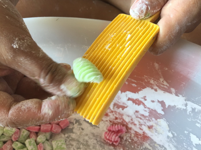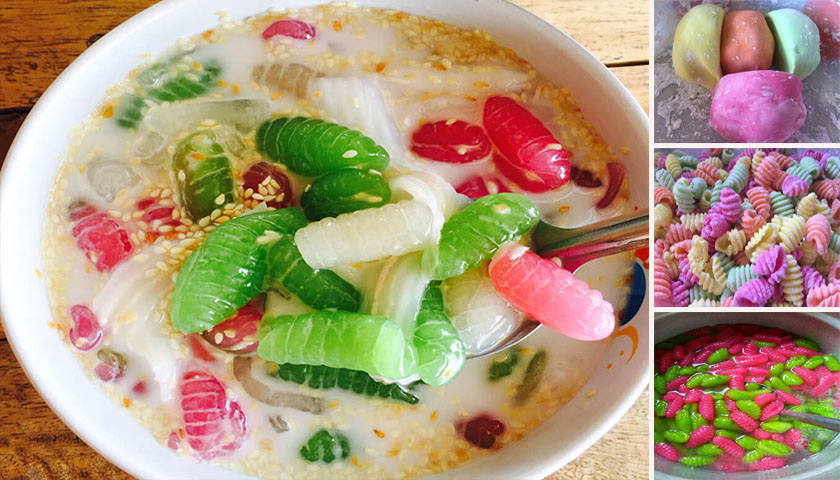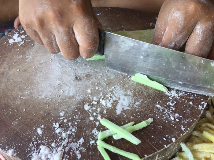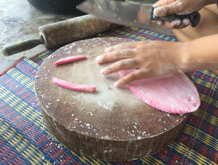 9. หลังจากนั้นทำเส้นรวมมิ ตรเพื่อเอาไปผสมกัน วิธีทำก็เหมือนกัน แต่จะตัดแป้งเป็นเส้นยาวๆ พอดีคำ
