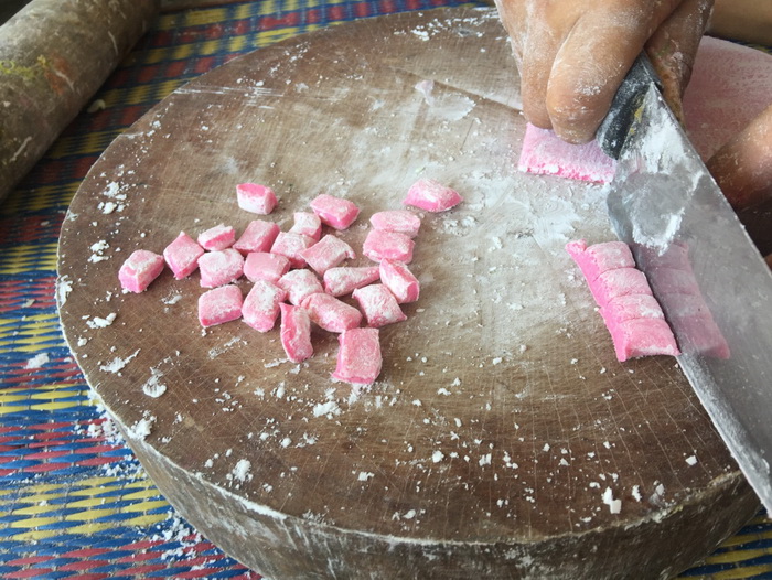 6. ตัดออกมาเป็นเส้นเสร็จ หั่นเป็นลูกเต๋าเลยคะ เดี๋ยวจะเอามากดเป็นครองแครงค่ะ