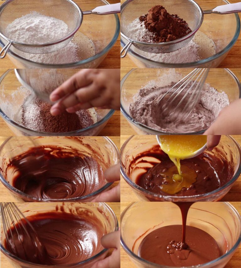 2.จ ากนั้นร่oนแป้งกับผงฟูและผงโกโก้ลงไป แล้วตะล่oมจนเข้ากัน ใส่เนยเค็มละล ายลงไป แ บ่ งใส่สั ก 2-3 รอบ