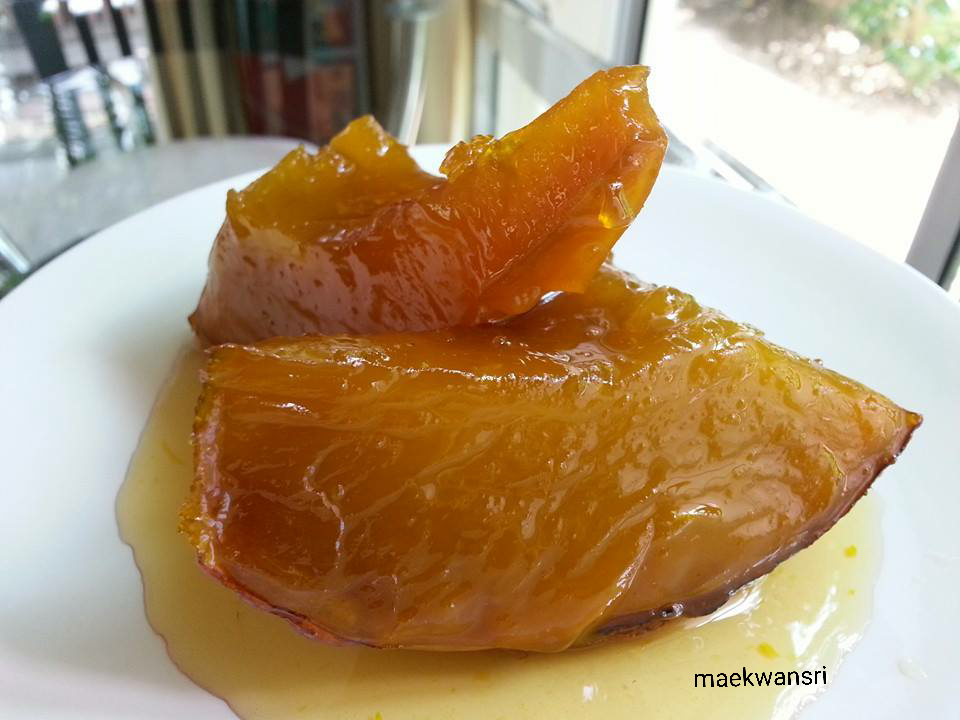 5.รอจนน้ำเชื่อมลดน้อยลง และฟั กทองสุ ก ปิดไ ฟ รอจนเย็น ตักใส่จานพร้อมเสิร์ฟ
