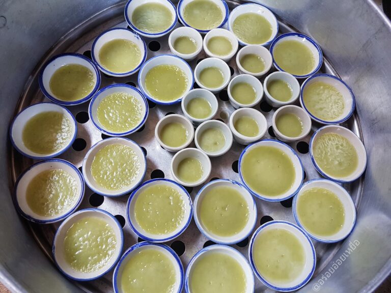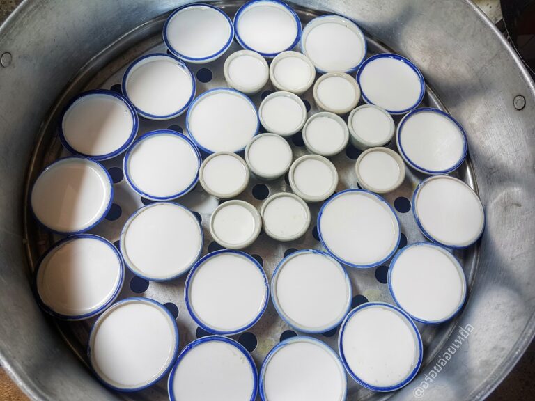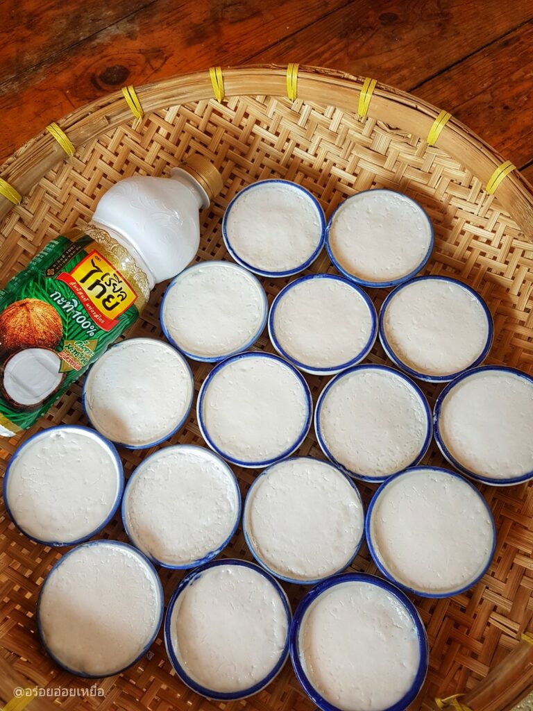 ตั กหน้ า กะทิ หยอดบ นตั วขนมให้เต็มถ้วยตะไล นึ่ งไ ฟกลาง 5-8 นาที.. แต่ถ้าชอบหน้ ากะทิเนียนเรียบ