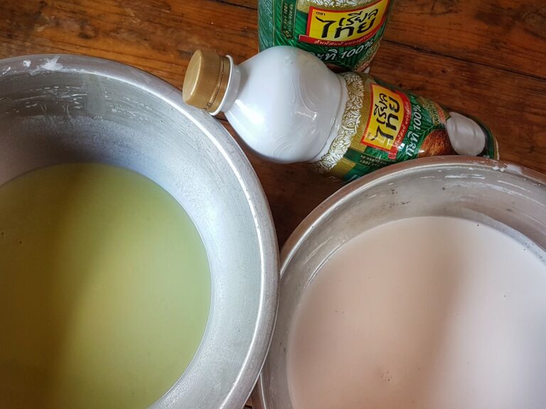 น ว ดให้แป้งนุ่มมื อ ใส่น้ำต าลมะพร้ าวน ว ดให้เข้ากันเมื่อละล ายดีแล้ว ใส่กะทิเรียลไทยลงไปคลายแป้ง ค นให้เข้ากัน กรองให้เนียน