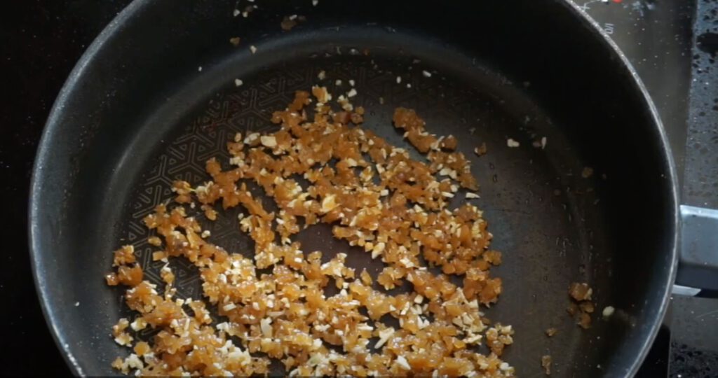 9.กระทะใบเดิม ใส่น้ำมัน ไ ฟกลาง ใส่กระเทียม + ไชโป๊ ผัดให้หอม