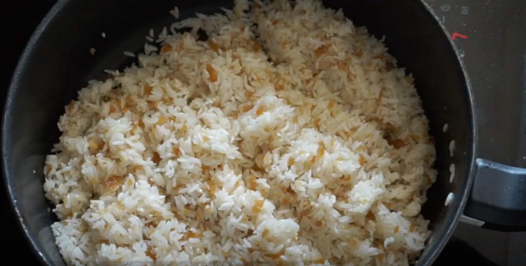 10. ใส่ข้าวที่สะเด็ดน้ำแล้ว ผัดๆคลุกๆ แล้วปรุงรส น้ำมันหอย + ซีอิ๊วขาว + พริกไทย + น้ำตาล คลุกๆผัดๆ
