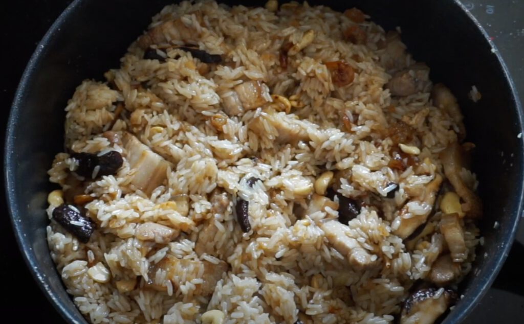 ตักข้าวที่ผัดไว้มาใส่ โปะด้วยกุนเชียง ไข่เค็ม และเกาลัด